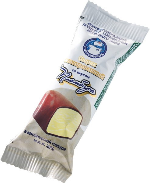 Состав продукта: молокосодержащий продукт с з.м.ж., произведённый по технологии творога, глазурь кондитерская, наполнитель, сахар, ароматизатор.