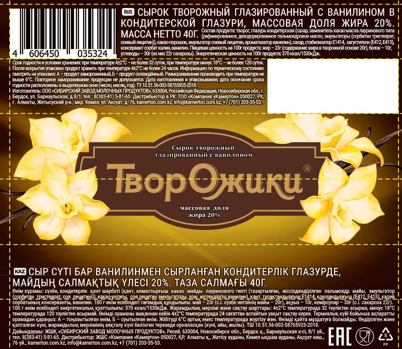 Состав продукта: творог, глазурь кондитерская, сахар, консервант сорбат калия, ванилин. Пищевая ценность на 100г продукта: жир – 23г (содержание жира в творожной основе 20г), белок – 10г, углеводы – 30г (из них 22г сахарозы). Энергетическая ценность на 100г продукта: 370 ккал/1530кДж. Срок годности и условия хранения: при температуре 4±2°С – не более 32 суток, при температуре минус 18°С – не более 120 суток. После вскрытия упаковки продукт хранить при температуре 4±2°С не более 24 часов. Информацию по термическому состоянию смотреть на упаковке: А – продукт замороженный, Б – продукт охлаждённый. Размораживание производить при температуре не выше 6°C. Повторное замораживание продукции не допускается. Дата изготовления и упаковывания, дата окончания срока годности расположены в выделенном окне (число, месяц, год). Масса нетто 40г. ТУ 10.51.56-002-58765925-2018.