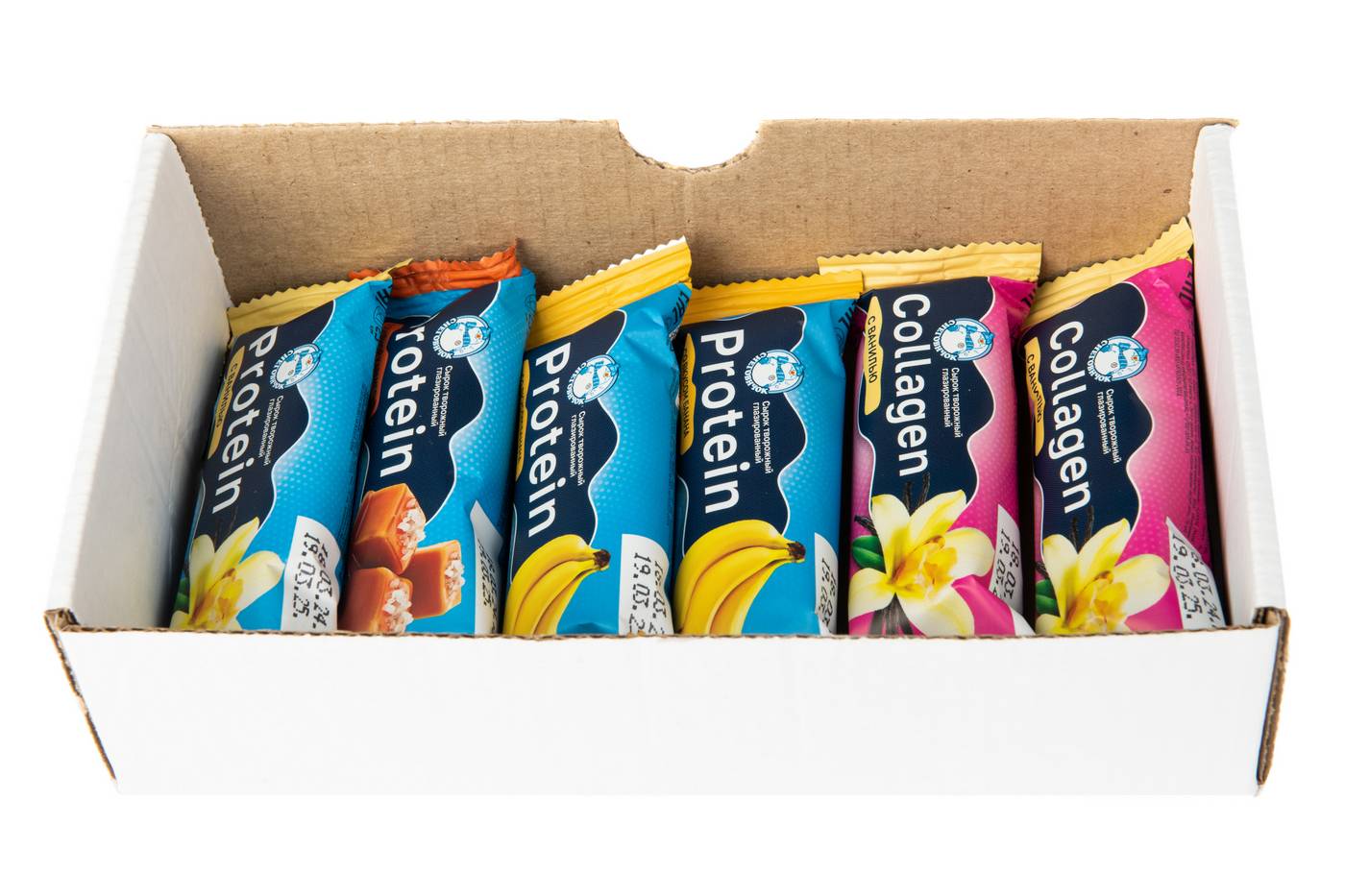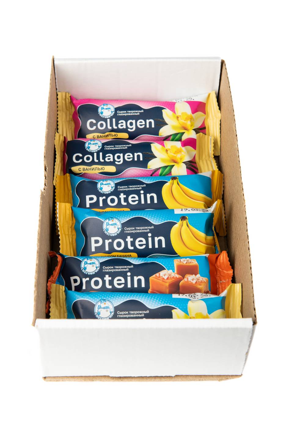 Сырки творожные, обогащённые коллагеном или протеином, в кондитерской глазури, м.д.ж.20%, 40г. В открытой коробке.