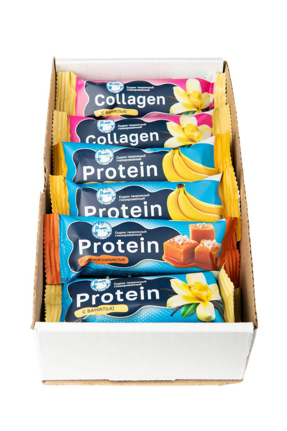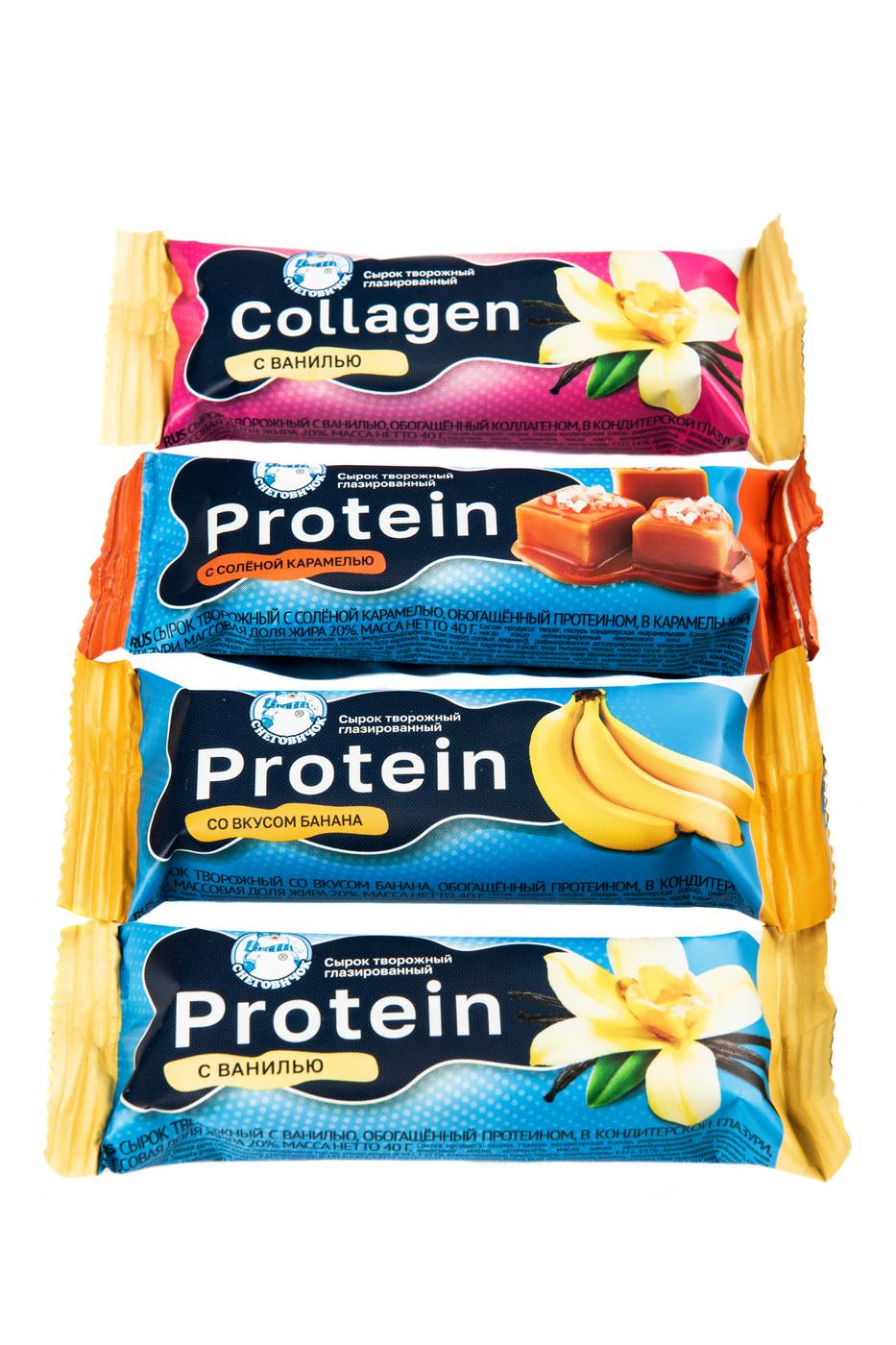 Сырки творожные, обогащённые протеином или коллагеном, в кондитерской глазури, массовая доля жира 20%. Масса нетто 40 г. Состав продукта: творог, глазурь кондитерская, сахар, коллаген гидролизованный (для обогащения), или концентрат молочного белка (для обогащения), стабилизатор (Е1414, Е401, Е415), концентрат сывороточного белка (для обогащения), ароматизатор «Ваниль», комплексная пищевая добавка «Смесь подсластителей Green Sweet» (подсластители: Е955, Е950; фруктоза), консервант сорбат калия, соль пищевая.