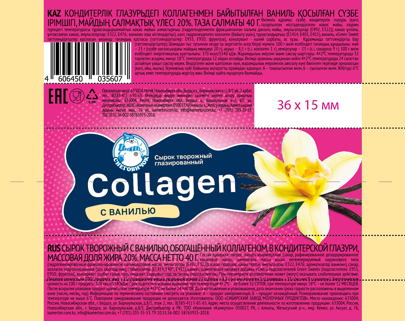 Сырок творожный с ванилью, обогащённый коллагеном, в кондитерской глазури, массовая доля жира 20%. Масса нетто 40 г.