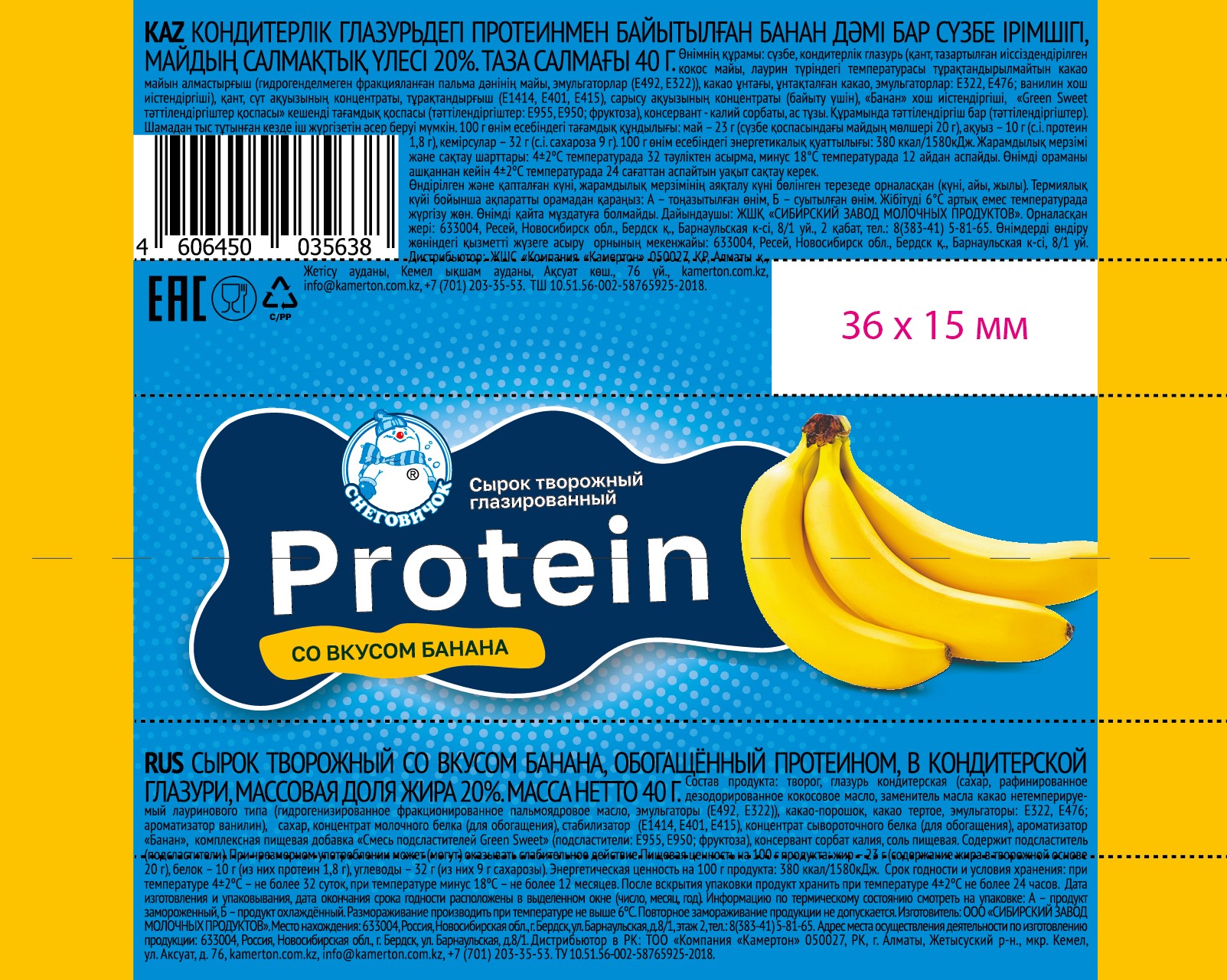 Сырок творожный со вкусом банана, обогащённый протеином, в кондитерской глазури, массовая доля жира 20%. Масса нетто 40 г.