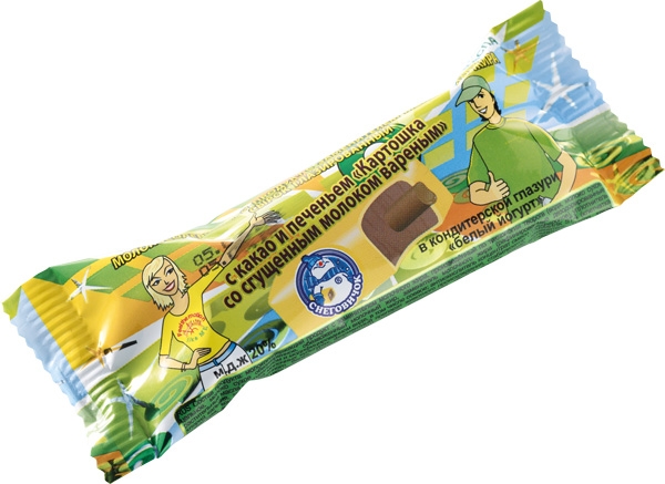 Сырок глазированный с какао и печеньем «Картошка со сгущенным молоком вареным» в белом йогурте
