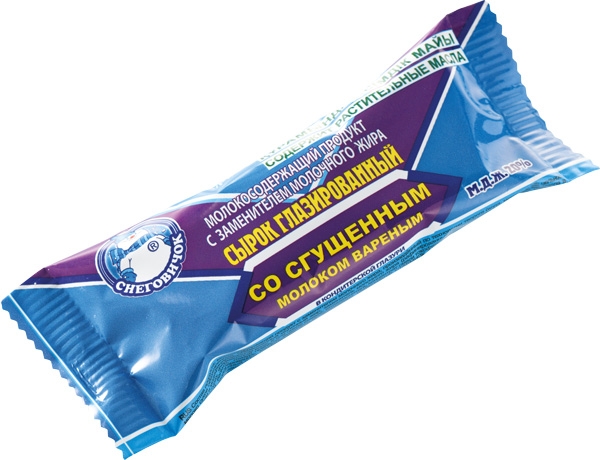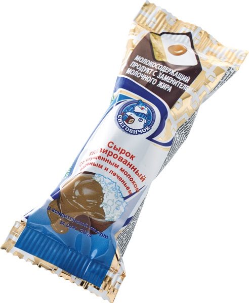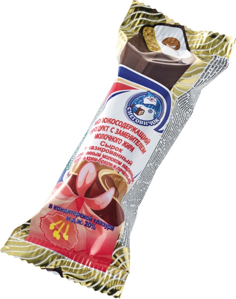 Состав продукта: молокосодержащий продукт с з.м.ж., произведённый по технологии творога, глазурь кондитерская, наполнитель, сахар, ароматизатор.