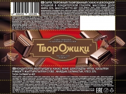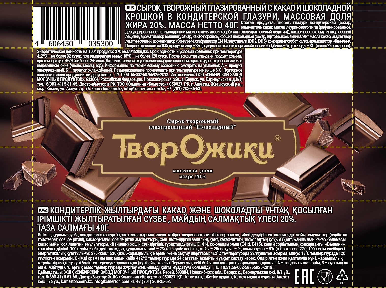 Состав продукта: творог, глазурь кондитерская, какао-порошок, сахар, какао-порошок, крошка шоколадная, консервант сорбат калия, ароматизатор «Ванилин». Пищевая ценность на 100г продукта: жир – 23г (содержание жира в творожной основе 20г), белок – 9г, углеводы – 31г (из них 22г сахарозы). Энергетическая ценность на 100г продукта: 370 ккал/1530кДж. Срок годности и условия хранения: при температуре 4±2ºС – не более 32 суток, при температуре минус 18ºС – не более 120 суток. После вскрытия упаковки продукт хранить при температуре 4±2ºС не более 24 часов. Дата изготовления и упаковывания, дата окончания срока годности расположены в выделенном окне (число, месяц, год). Информацию по термическому состоянию смотреть на упаковке: А – продукт замороженный, Б – продукт охлаждённый. Размораживание производить при температуре не выше 6˚C. Повторное замораживание продукции не допускается.