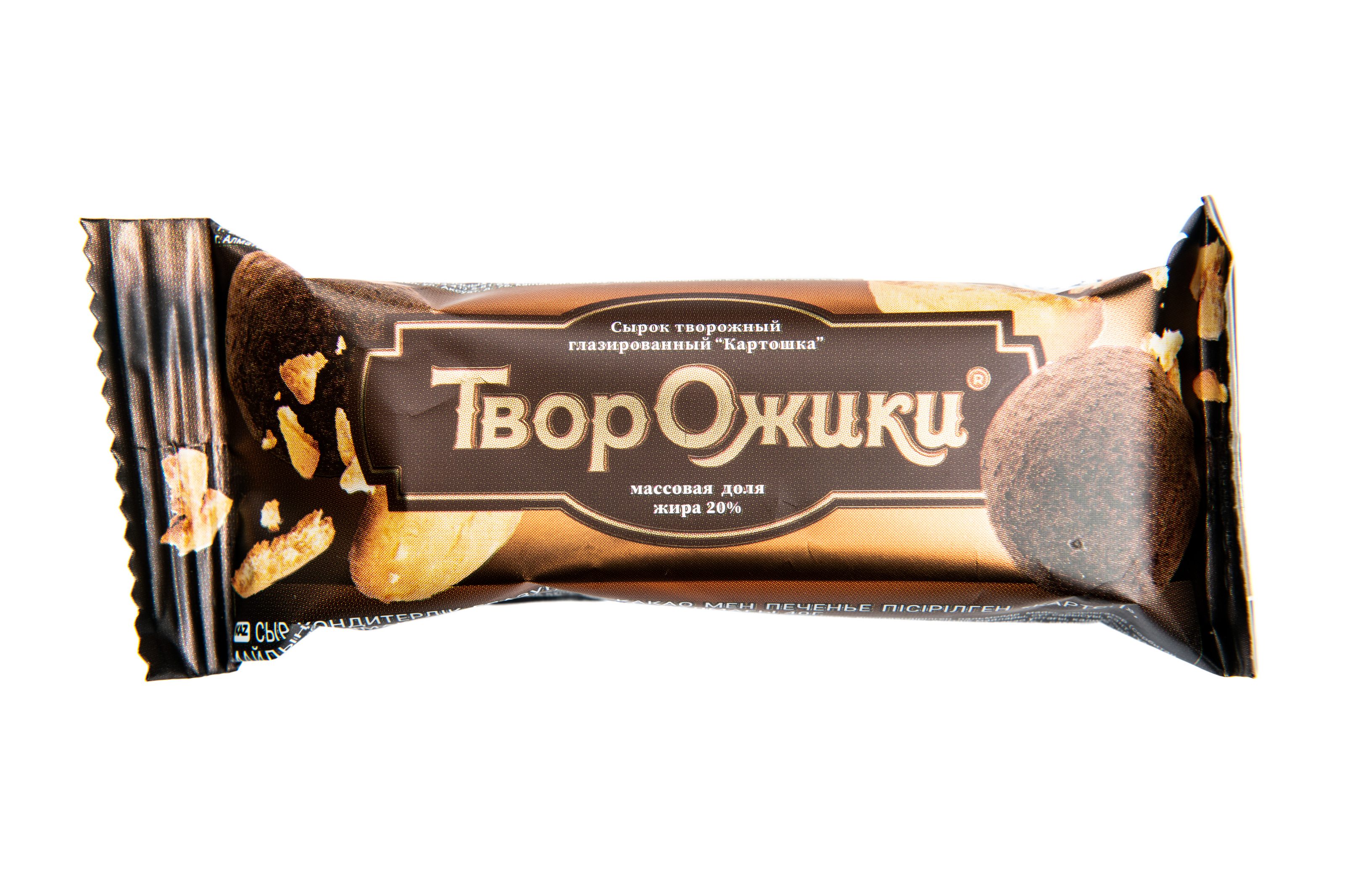 Сырок творожный глазированный с какао и печеньем «Картошка» в кондитерской глазури, массовая доля жира 20%.