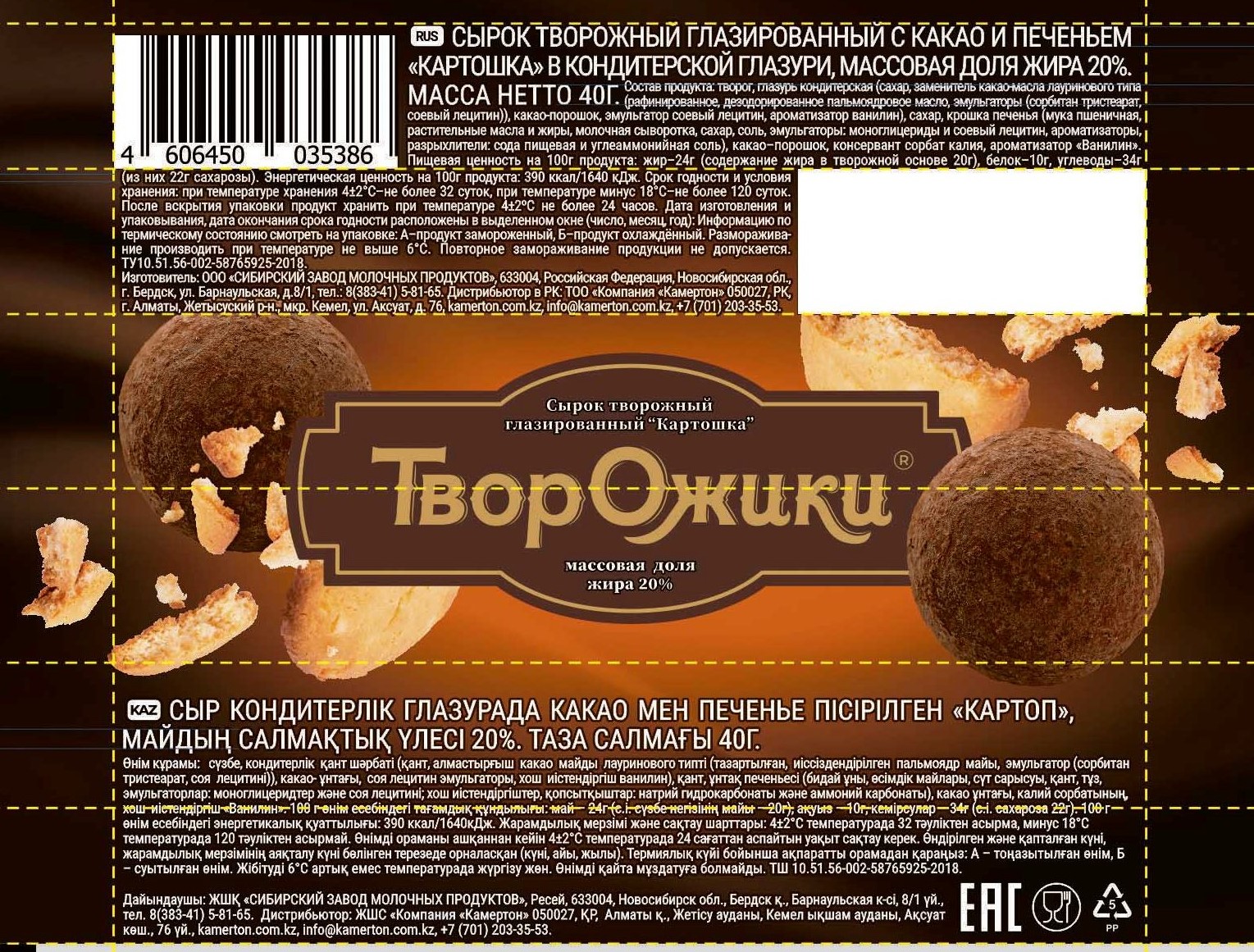 Состав продукта: творог, глазурь кондитерская, сахар, крошка печенья,какао – порошок, ароматизатор «Ванилин». Пищевая ценность на 100г продукта: жир – 24г (содержание жира в творожной основе 20г), белок – 10г, углеводы – 34г (из них 22г сахарозы). Энергетическая ценность на 100г продукта: 390 ккал/1640 кДж. Срок годности и условия хранения: при температуре хранения 4±2°С – не более 32 суток, при температуре минус 18°С – не более 120 суток. После вскрытия упаковки продукт хранить при температуре 4±2ºС не более 24 часов.Дата изготовления и упаковывания, дата окончания срока годности расположены в выделенном окне (число, месяц, год): Информацию по термическому состоянию смотреть на упаковке: А – продукт замороженный, Б – продукт охлаждённый. Размораживание производить при температуре не выше 6°C. Повторное замораживание продукции не допускается. Масса нетто 40г.
