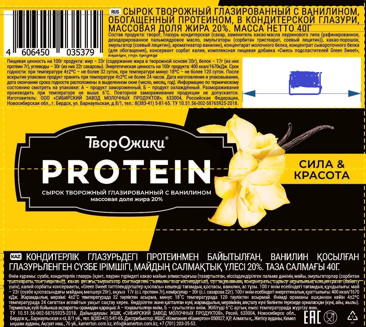Сырок творожный глазированный с ванилином, обогащенный протеином, в кондитерской глазури,массовая доля жира 20%, масса нетто 40г