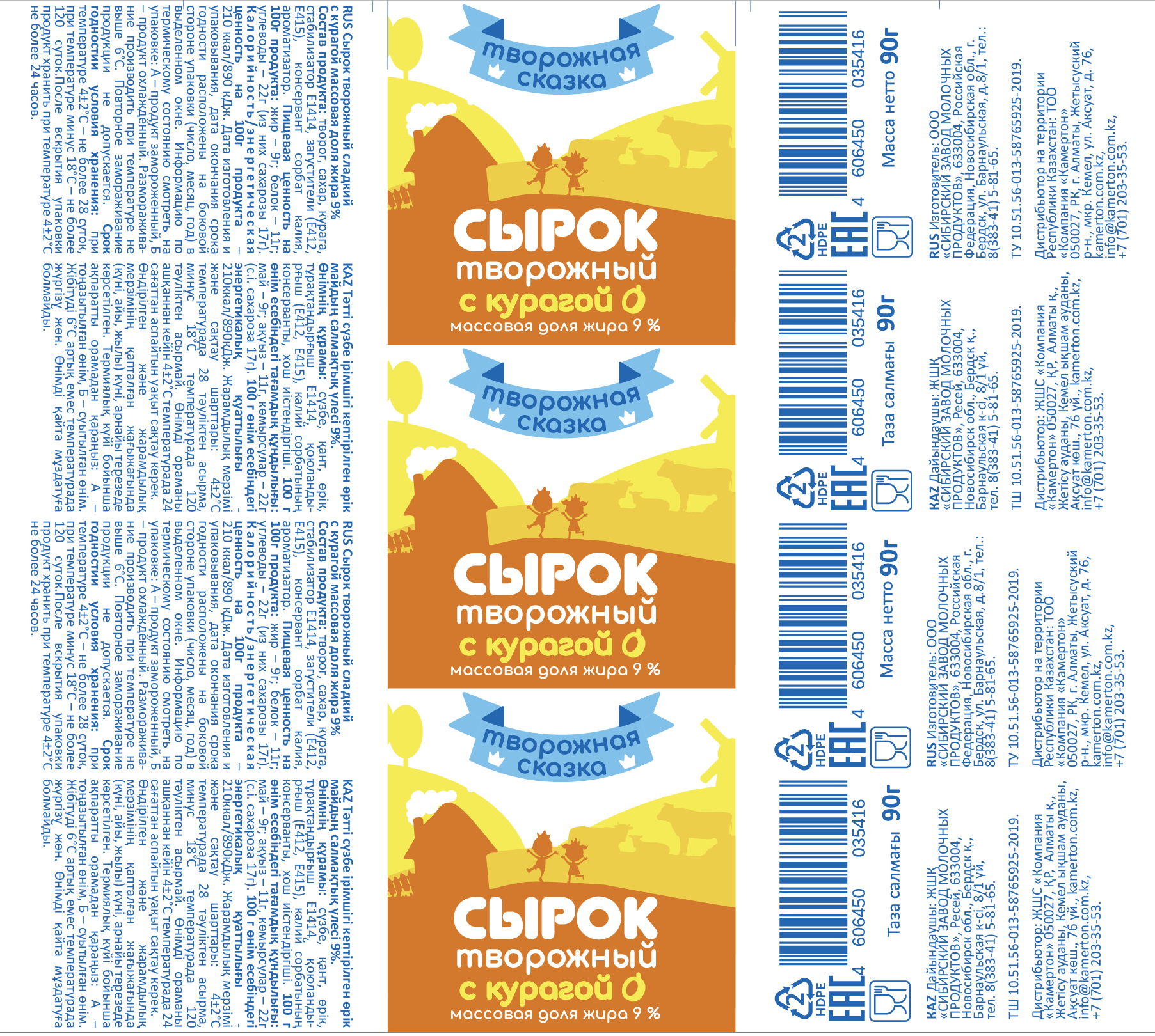 Сырок творожный сладкий с курагой, массовая доля жира 9%, Торговый знак «Творожная сказка»