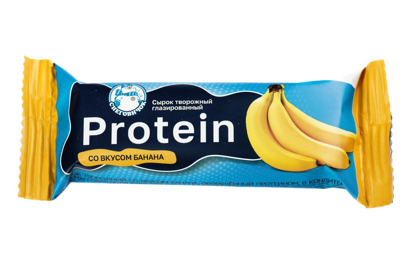 Сырок творожный со вкусом банана, обогащённый протеином, в кондитерской глазури, массовая доля жира 20%. Масса нетто 40 г.