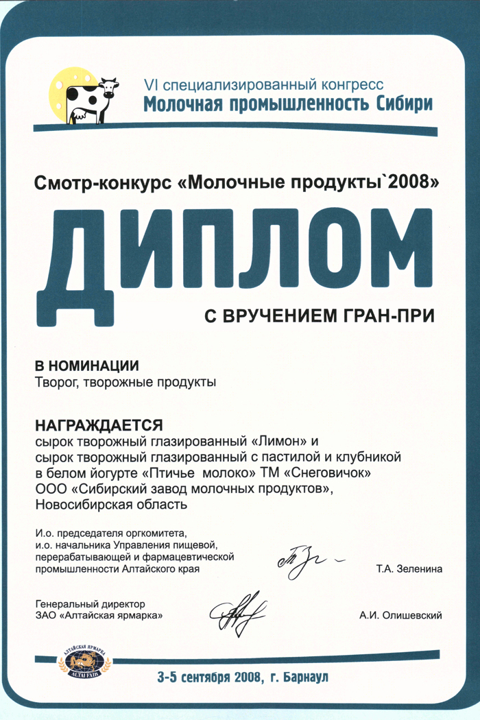 Диплом с вручением ГРАН-ПРИ в номинации "Творог, творожные продукты". VI Специализированный конгресс "Молочная промышленность Сибири", г. Барнаул, 2008 г.