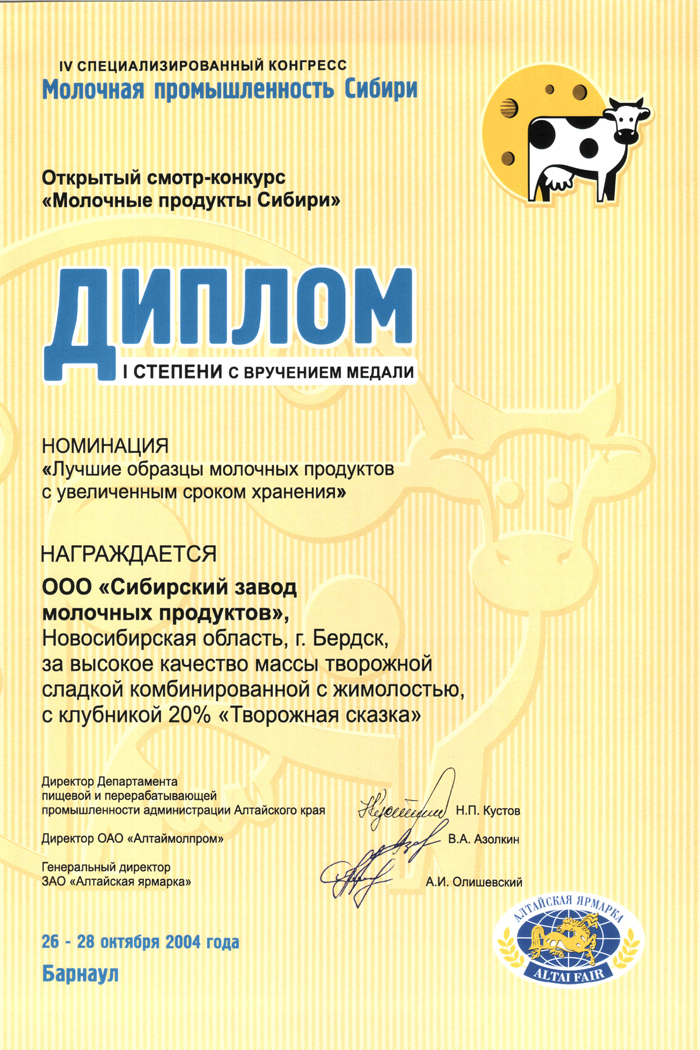 Диплом I степени с вручением медали в номинации "Лучшие образцы сырково-творожных изделий". IV Специализированный конгресс "Молочная промышленность Сибири", г. Барнаул, 2004 г.