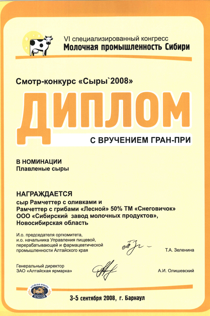 Диплом с вручением ГРАН-ПРИ в номинации "Плавленые сыры". VI Специализированный конгресс "Молочная промышленность Сибири", г. Барнаул, 2008 г.
