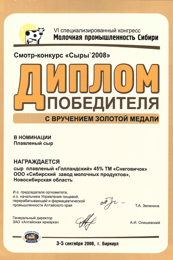 Диплом ПОБЕДИТЕЛЯ с вручением Золотой Медали в номинации "Плавленый сыр". VI Специализированный конгресс "Молочная промышленность Сибири", г. Барнаул, 2008 г.