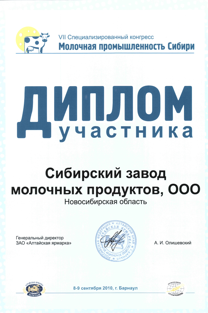 Диплом участника. VII Специализированный конгресс "Молочная промышленность Сибири", г. Барнаул, 2010 г.