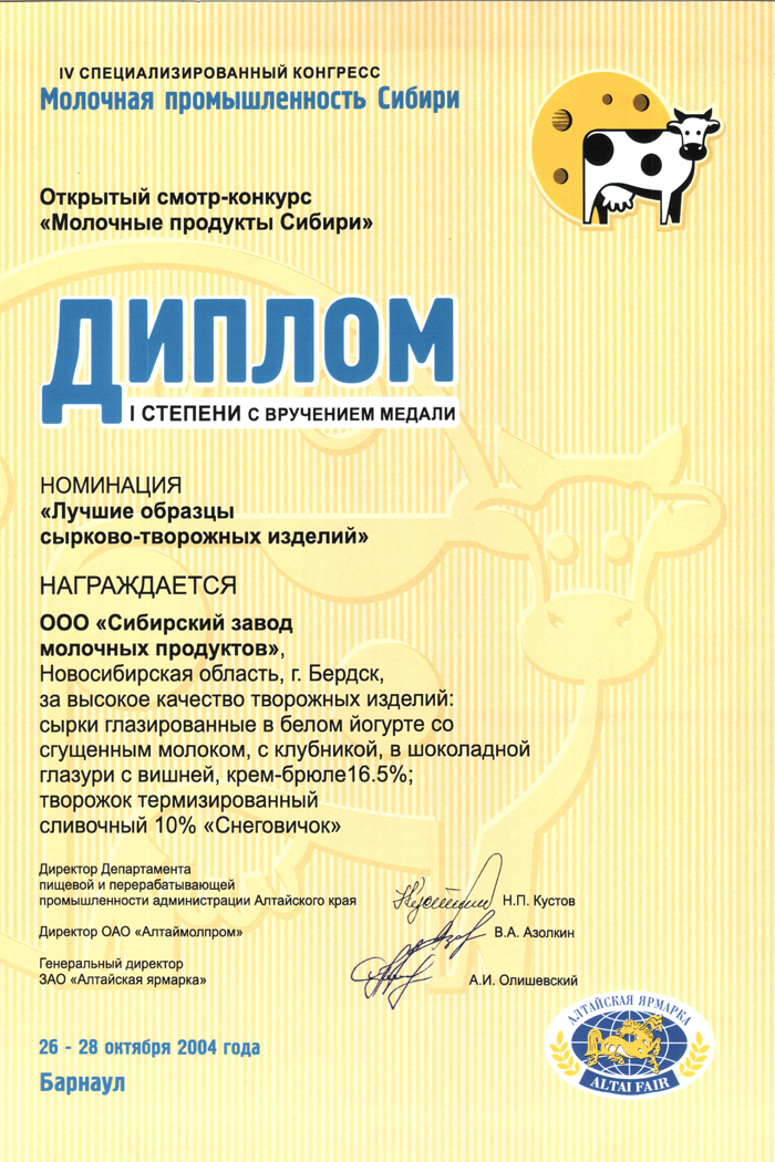Диплом I степени с вручением медали в номинации "Лучшие образцы сырково-творожных изделий". IV Специализированный конгресс "Молочная промышленность Сибири", г. Барнаул, 2004 г.