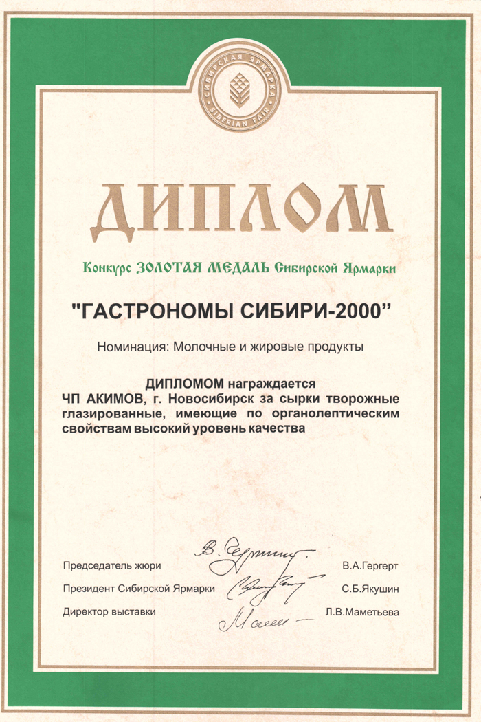 Диплом "Гастрономы Сибири - 2000" в номинации "Молочные и жировые продукты". Конкурс ЗОЛОТОЯ МЕДАЛЬ Сибирской Ярмарки, г. Новосибирск, 2000 г.