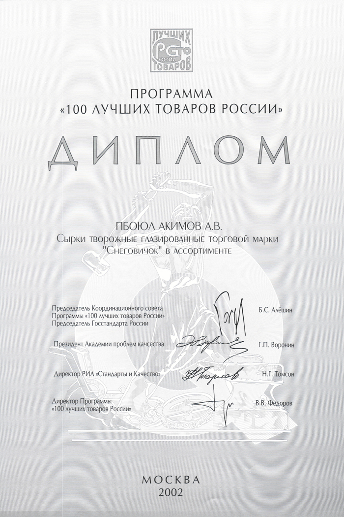Диплом всероссийской программы "100 лучших товаров России", г. Москва, 2002 г.