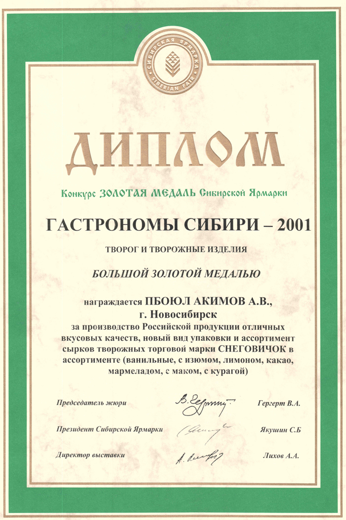 Диплом с вручением Большой Золотой Медали "Гастрономы Сибири - 2001" в номинации "Творог и творожные изделия". Конкурс ЗОЛОТОЯ МЕДАЛЬ Сибирской Ярмарки, г. Новосибирск, 2001 г.