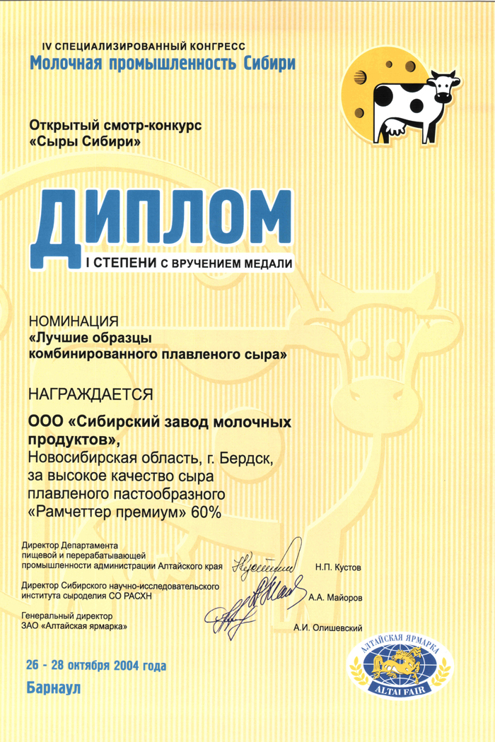 Диплом I степени с вручением Золотой Медали в номинации "Лучшие образцы комбинированного плавленого сыра". IV Специализированный конгресс "Молочная промышленность Сибири", г. Барнаул, 2004 г.