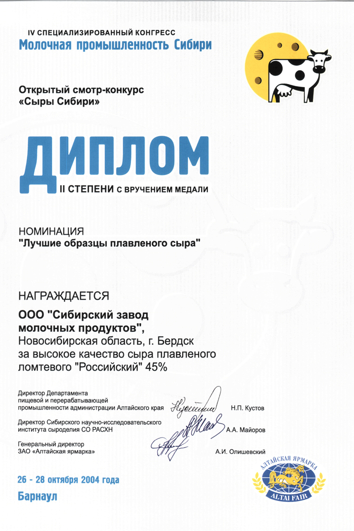 Диплом II степени с вручением Медали в номинации "Лучшие образцы плавленого сыра". IV Специализированный конгресс "Молочная промышленность Сибири", г. Барнаул, 2004 г.